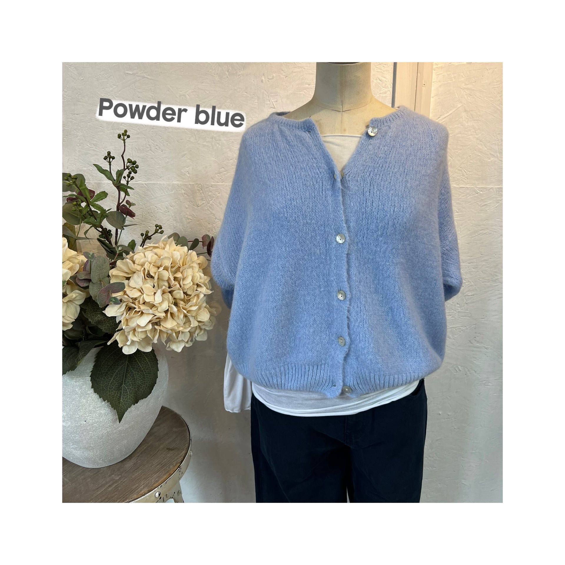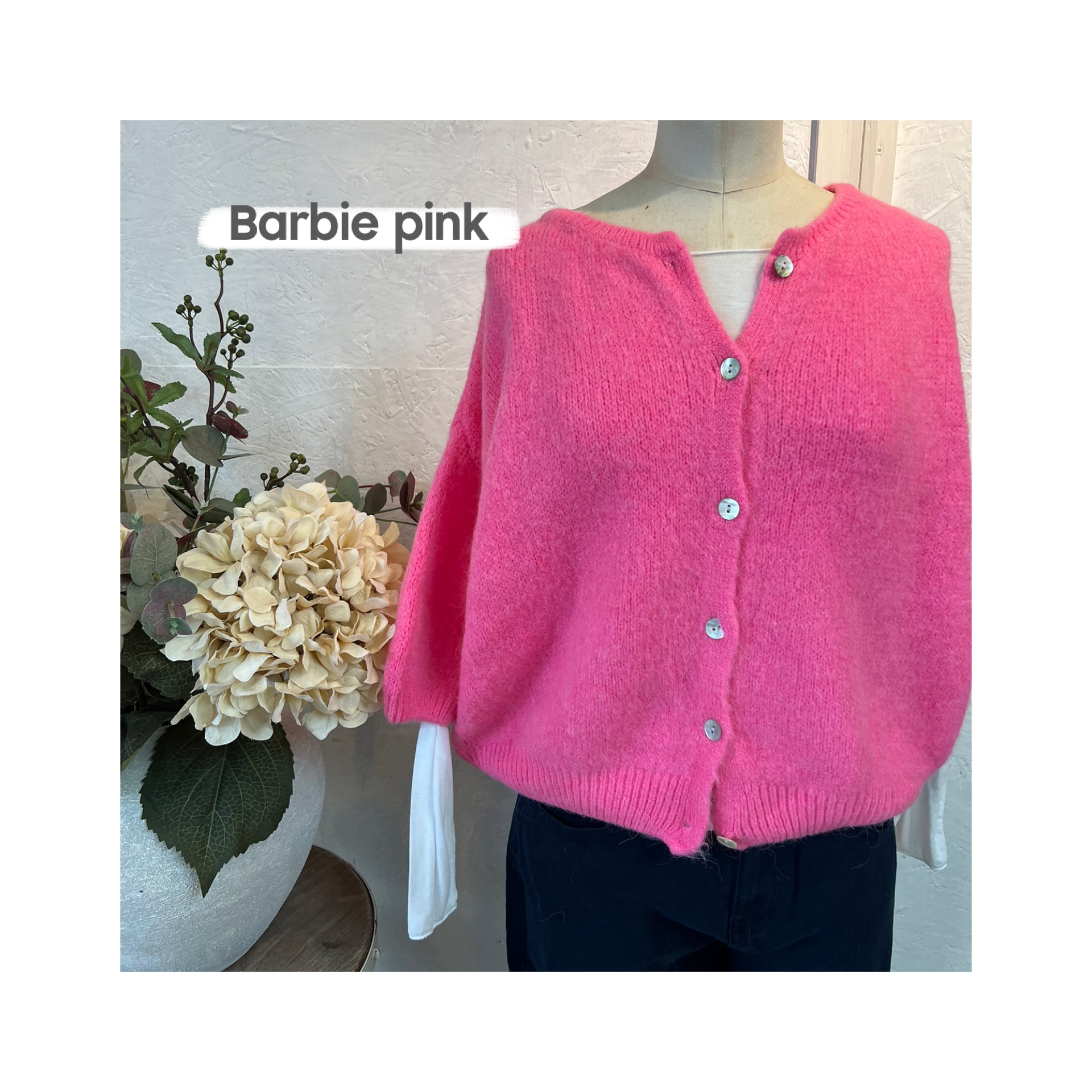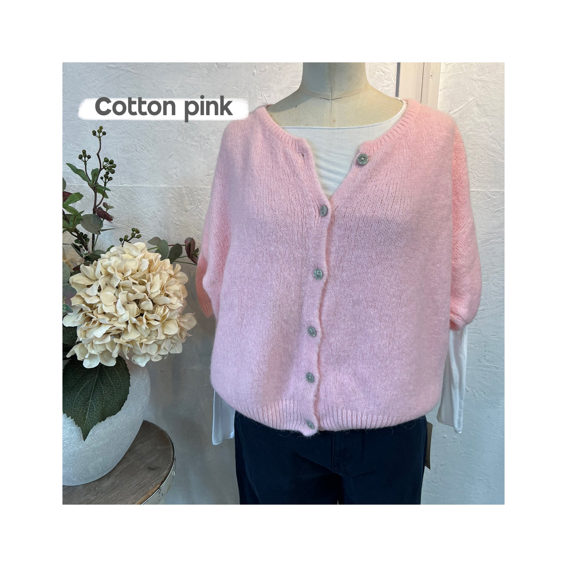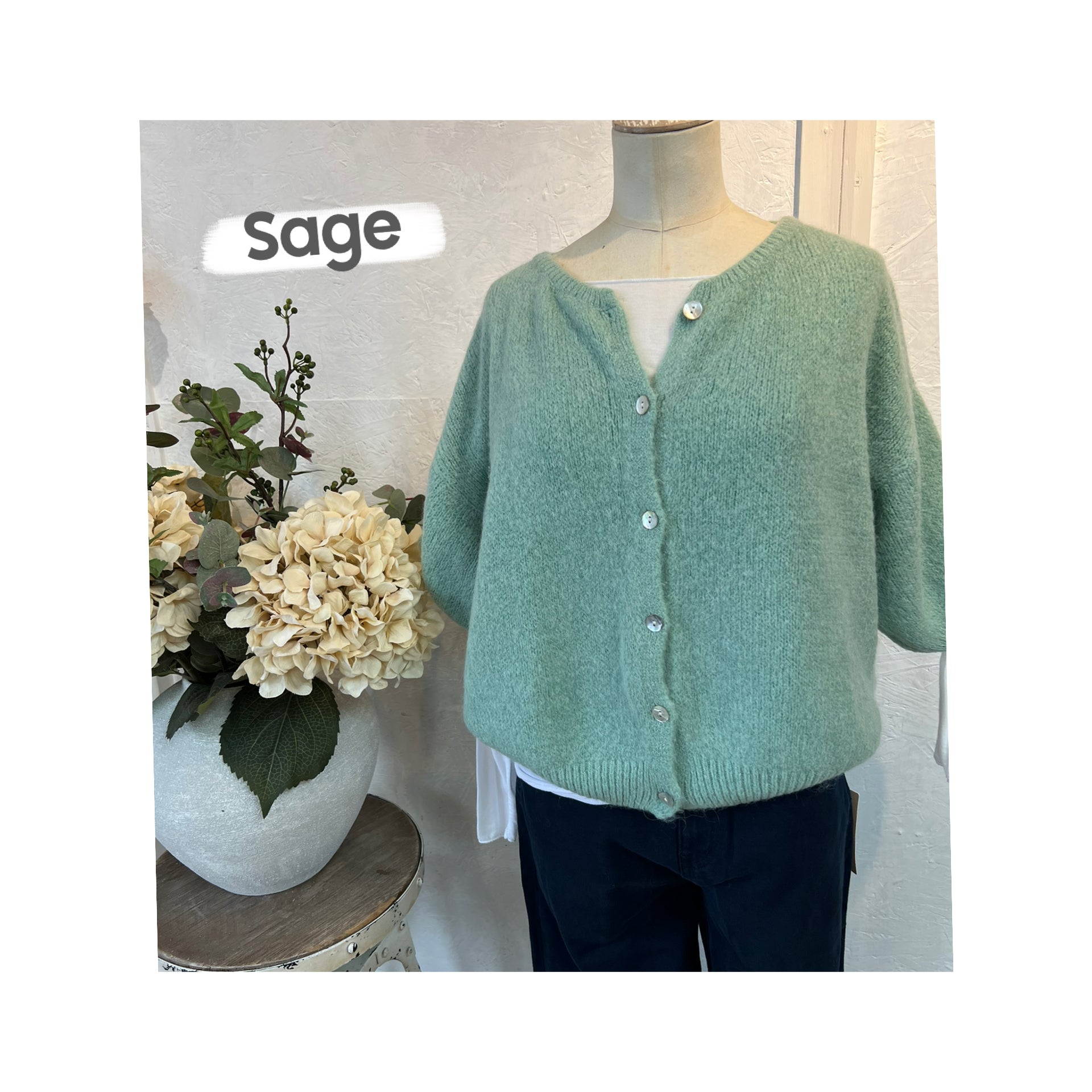 Alicia super soft cropped balloon sleeves cardigan with round neckline, pearlescent button detailing and ribbed trim detail.