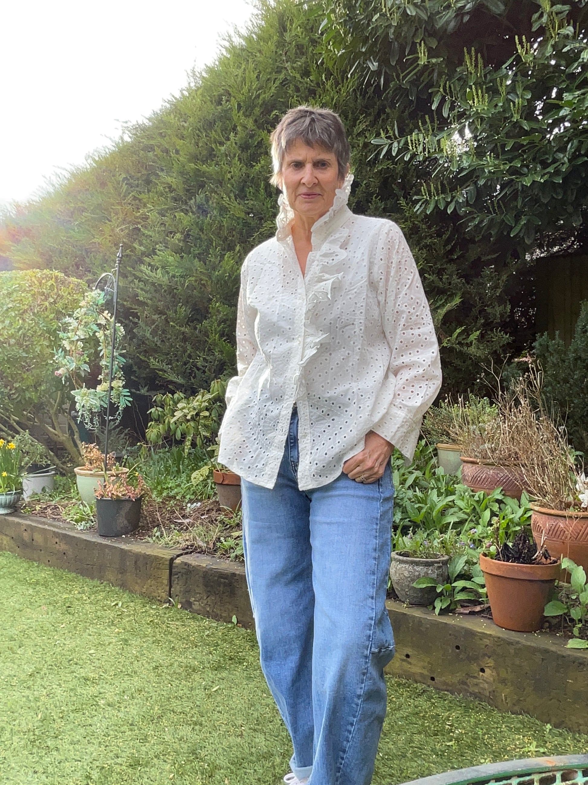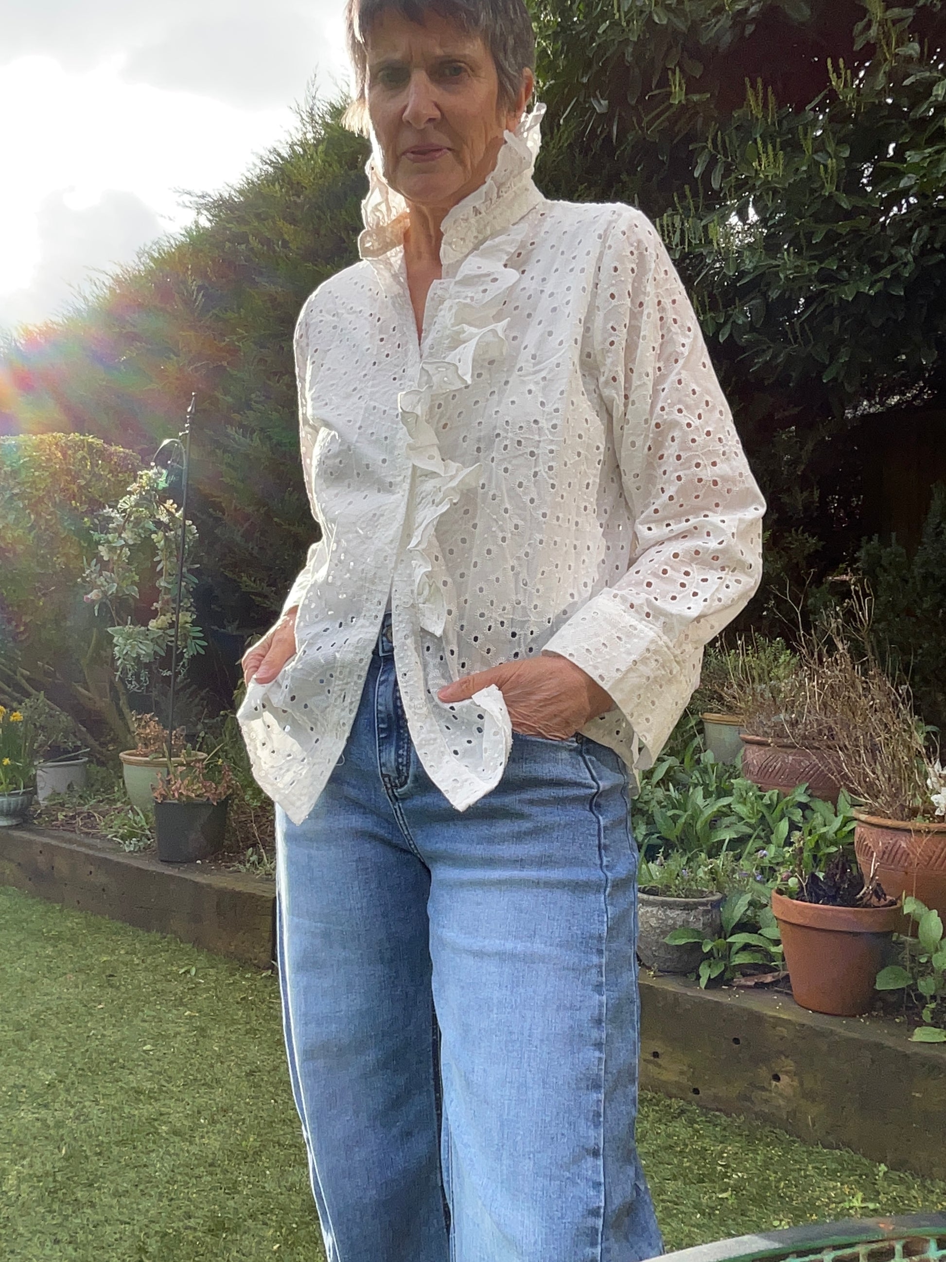 Charlie is our pretty 100% Cotton Broderie blouse with a frilled collar & plain cuffs on sleeves.
