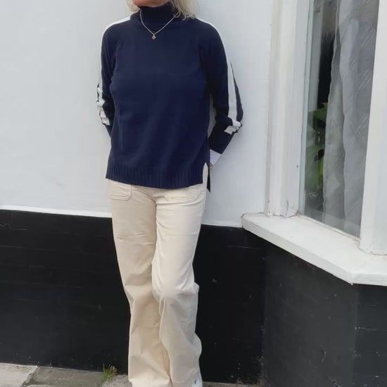 Fairford Cashmere Blend Roll Neck Jumper w/Stripe on Sleeve Navy/Ivory