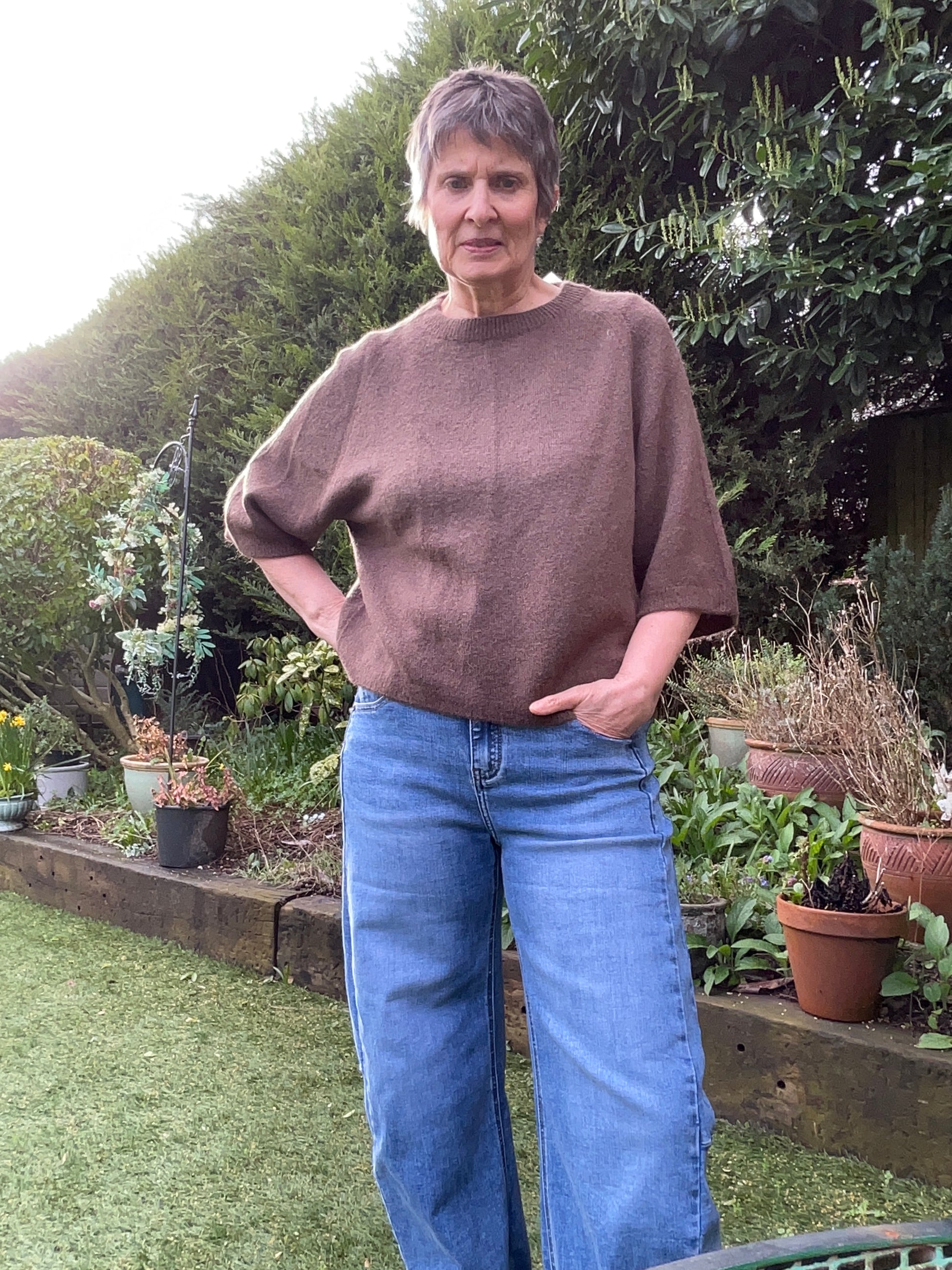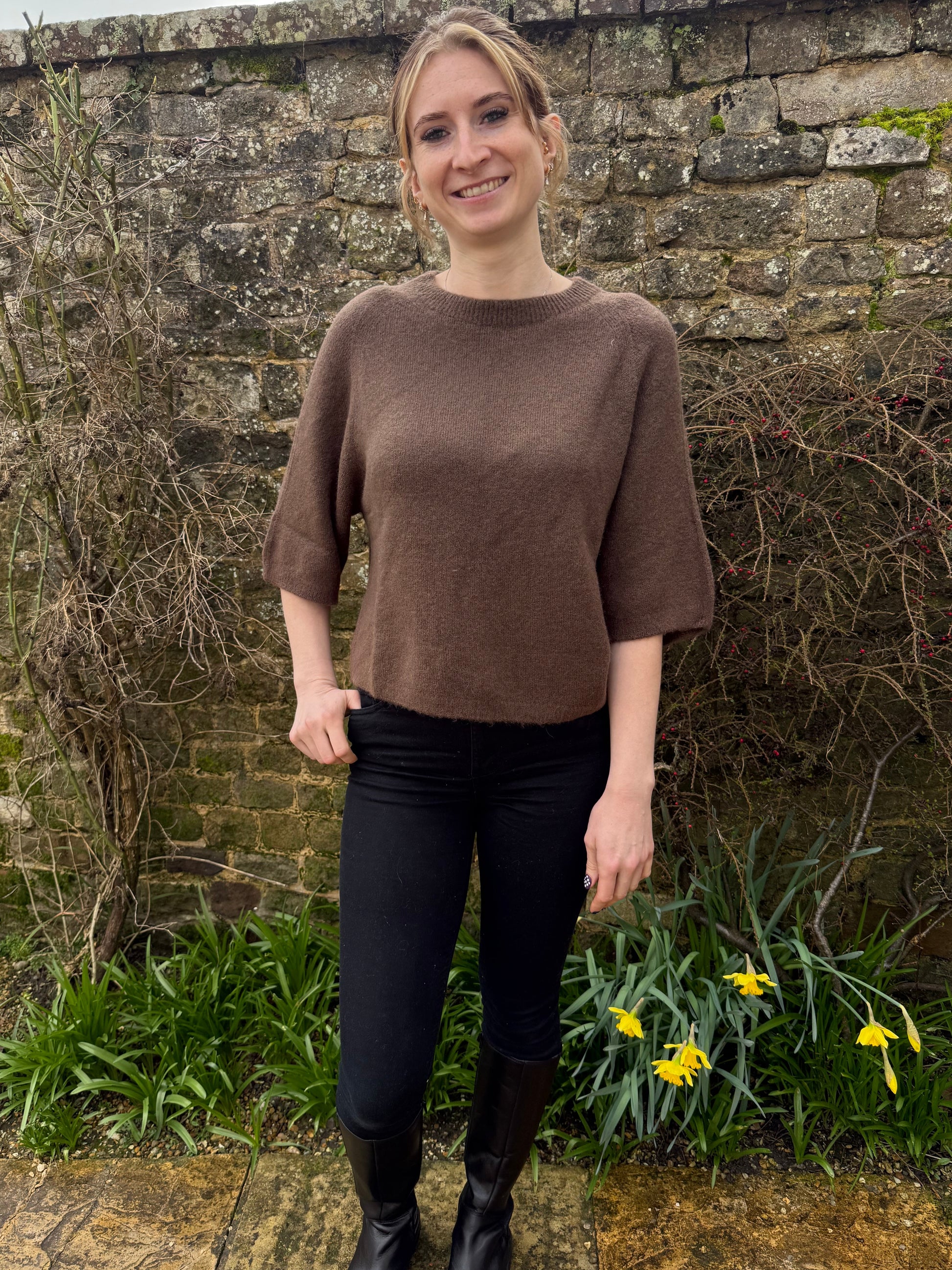 Our gorgeous Chloe brown short sleeve jumper is perfect for the spring weather to wear on its own or layer with a long sleeve top underneath.