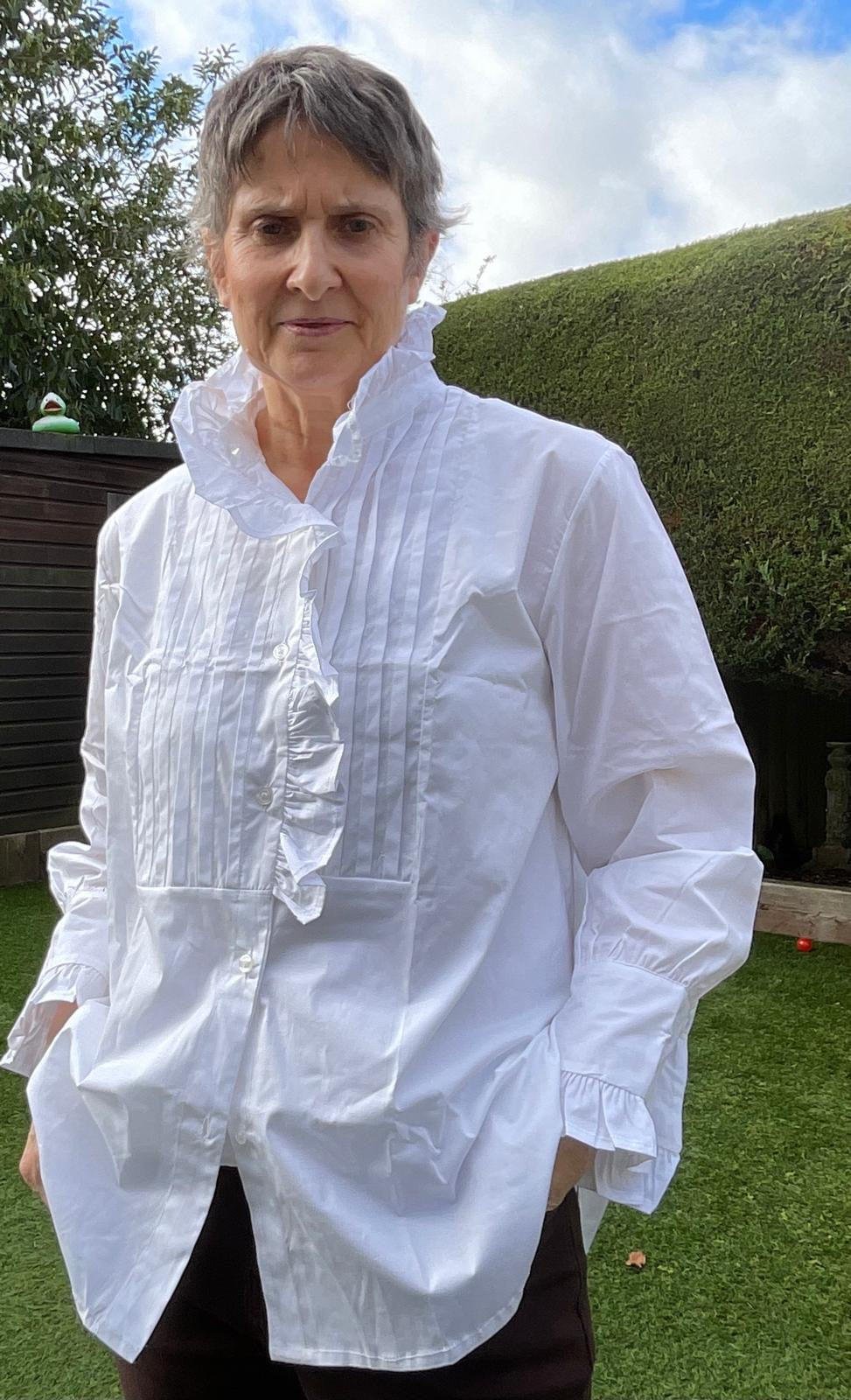 Lovely long white 100% cotton ruffle detail blouse.
