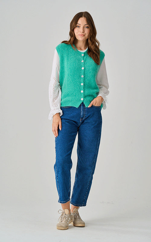 The Oaksey Alpaca Button Tank brings warmth and texture to your wardrobe, with a soft, tactile feel and considered design. Made from a luxurious alpaca blend, it features a button-down front and wide shoulder straps for a flattering, structured shape. Available in French Blue, Green, and French Pink, this piece works just as well layered over shirts and dresses as it does worn on its own. A versatile knit with character and comfort in equal measure.