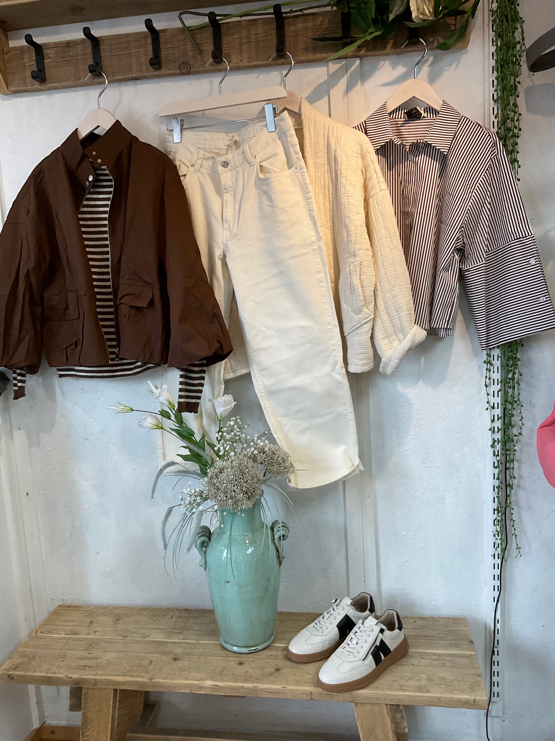 I’ve styled with our boyfriend jeans , cashmere mix striped jumper , cotton striped shirt .