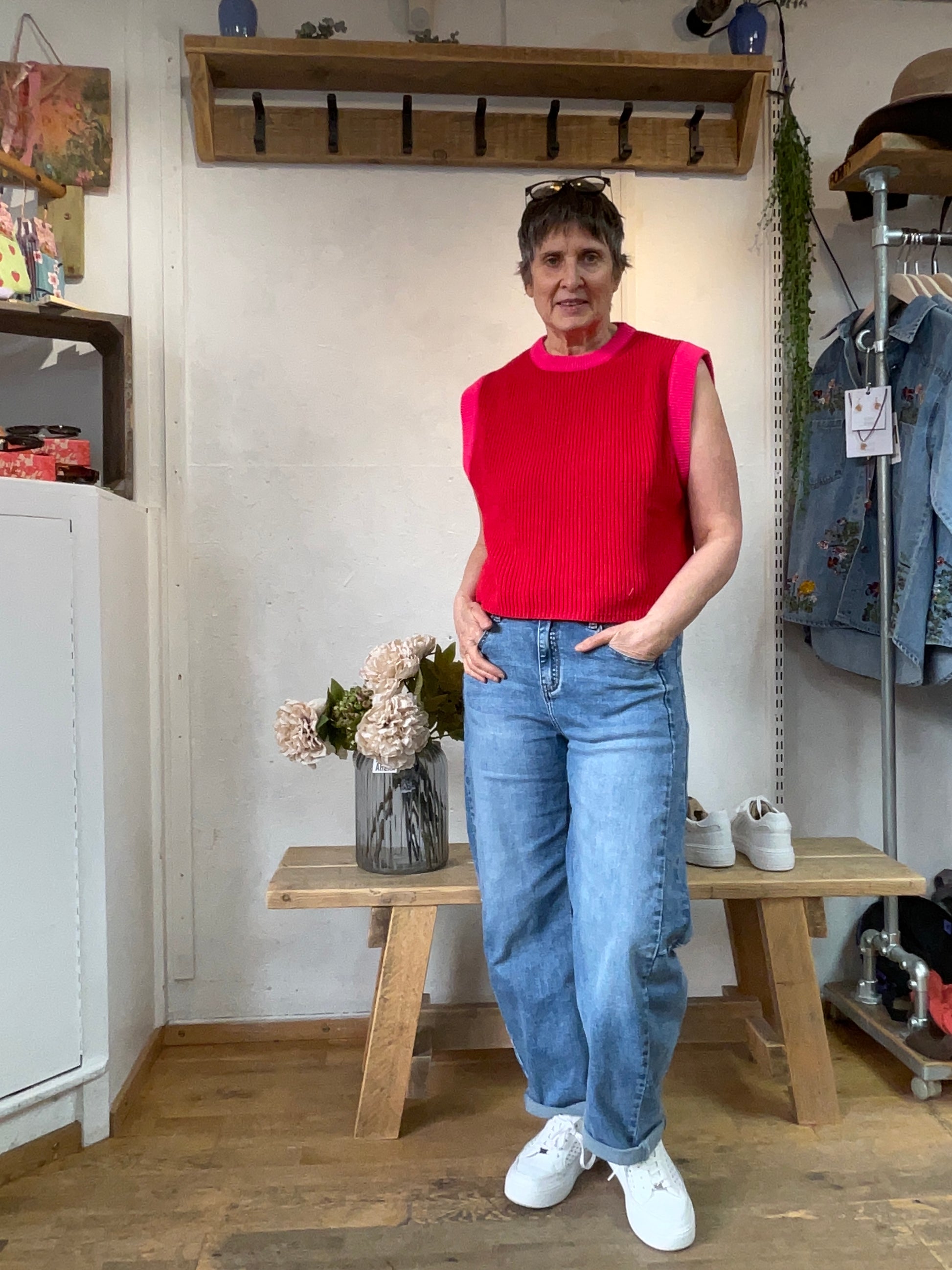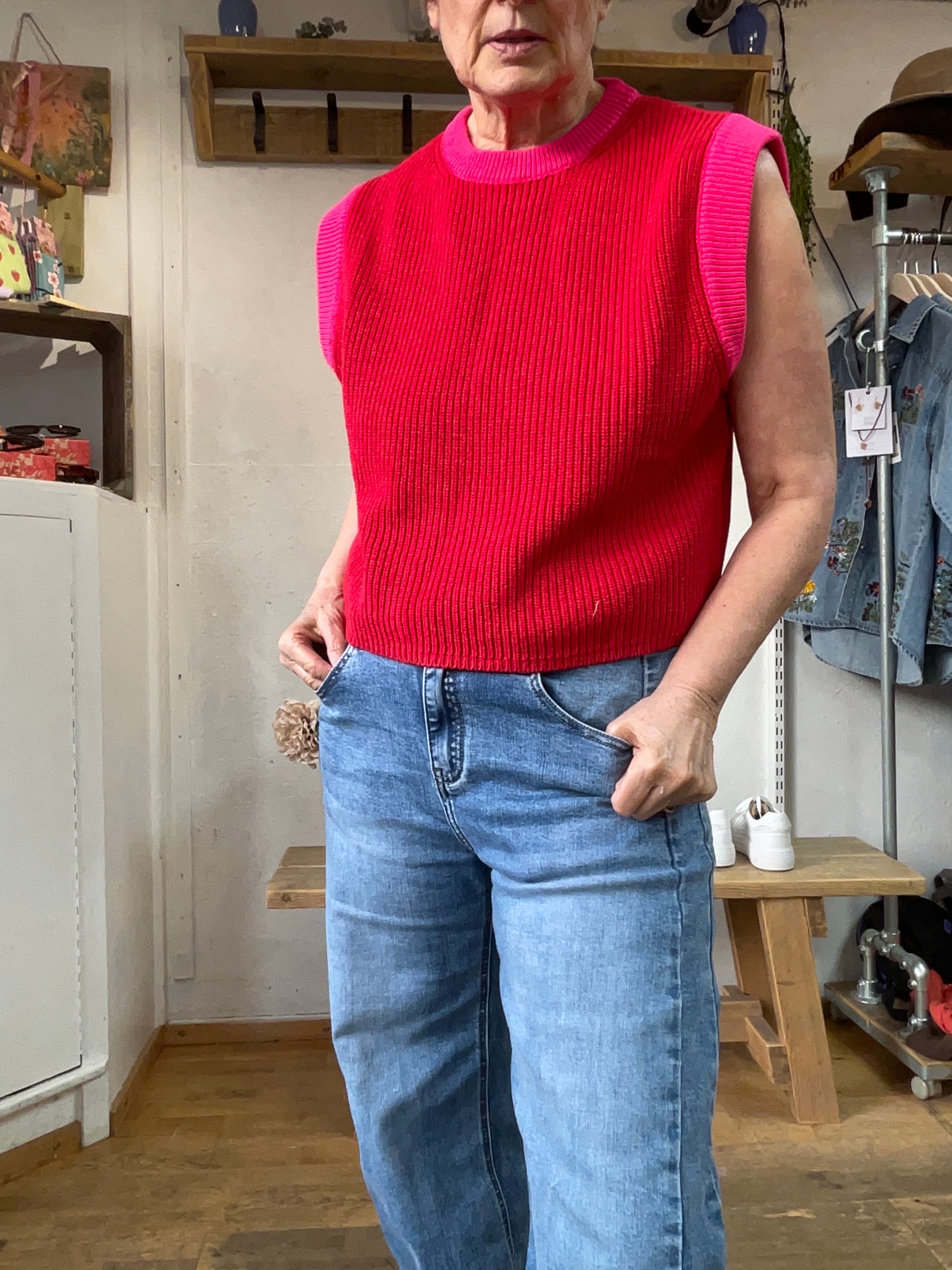 The Truro 100% Cotton Tank Top pairs a vibrant red base with playful pink contrast trim for a confident pop of colour. Designed for layering or wear as a sleeveless top for spring/summer..